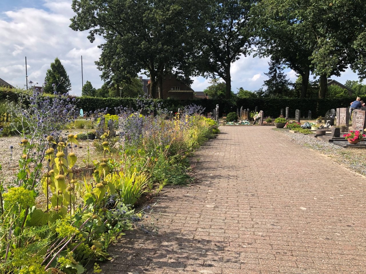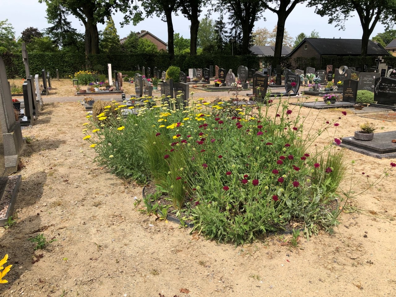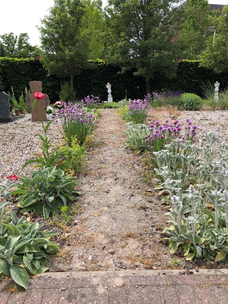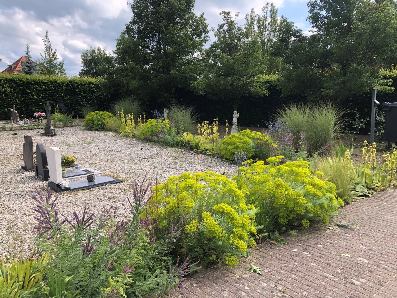 Op deze begraafplaats heb ik, waar mogelijk, wat vorm en kleur aangebracht. Vanwege de droge omstandigheden is er gekozen voor droogte minnende beplanting in een laag lava gesteente. Lava beschermt de planten tegen droogte en werkt als een spons, die water opneemt en ook weer afgeeft aan de planten.