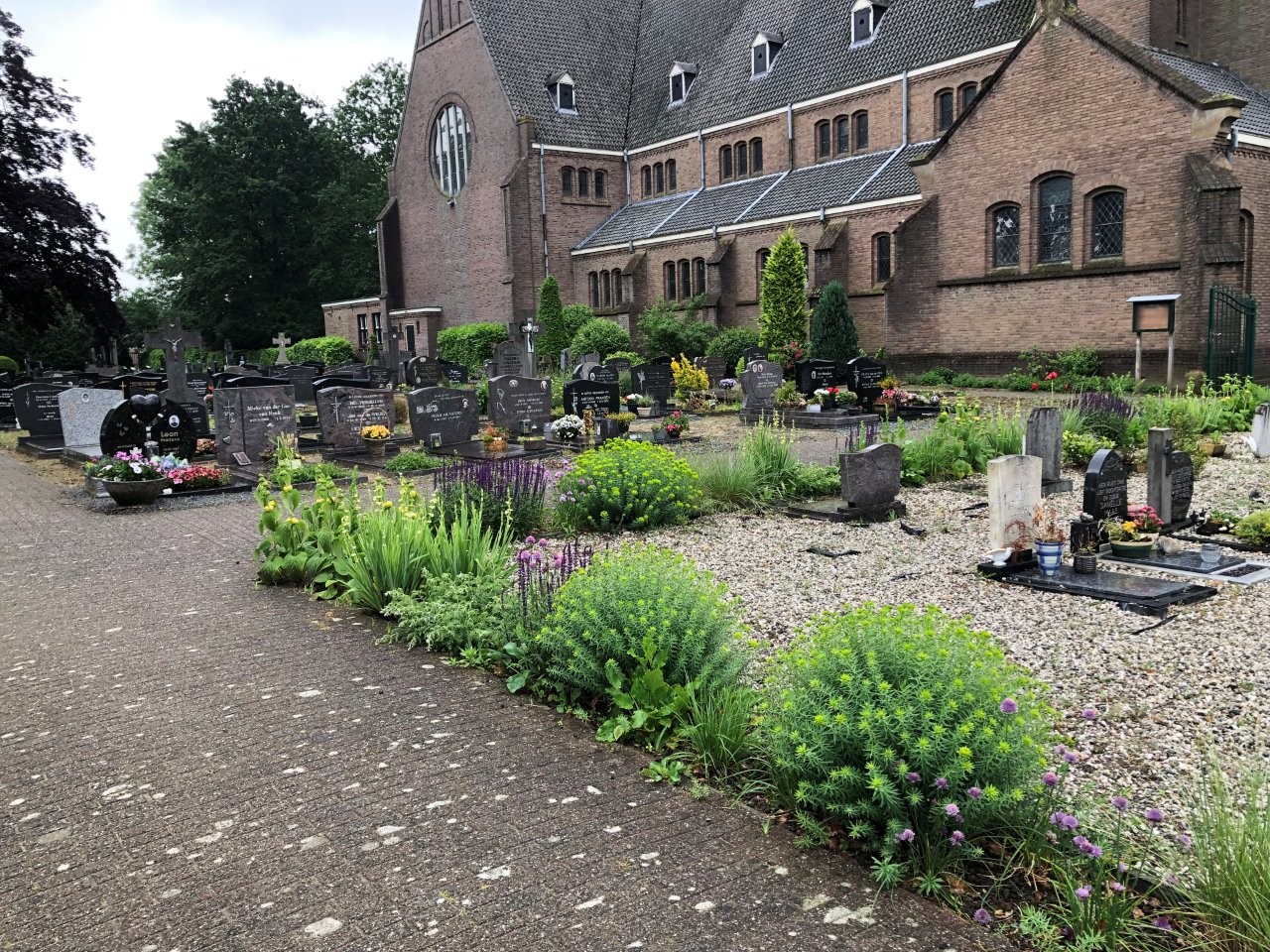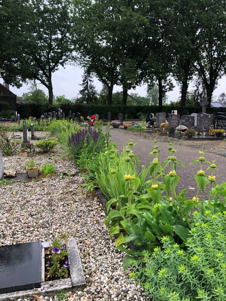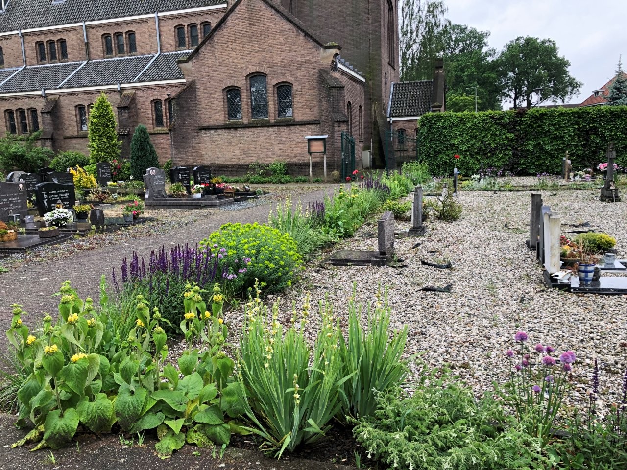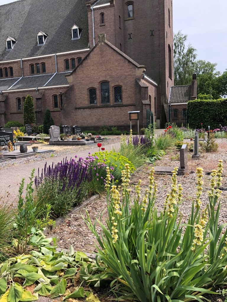 Op deze begraafplaats heb ik, waar mogelijk, wat vorm en kleur aangebracht. Vanwege de droge omstandigheden is er gekozen voor droogte minnende beplanting in een laag lava gesteente. Lava beschermt de planten tegen droogte en werkt als een spons, die water opneemt en ook weer afgeeft aan de planten.